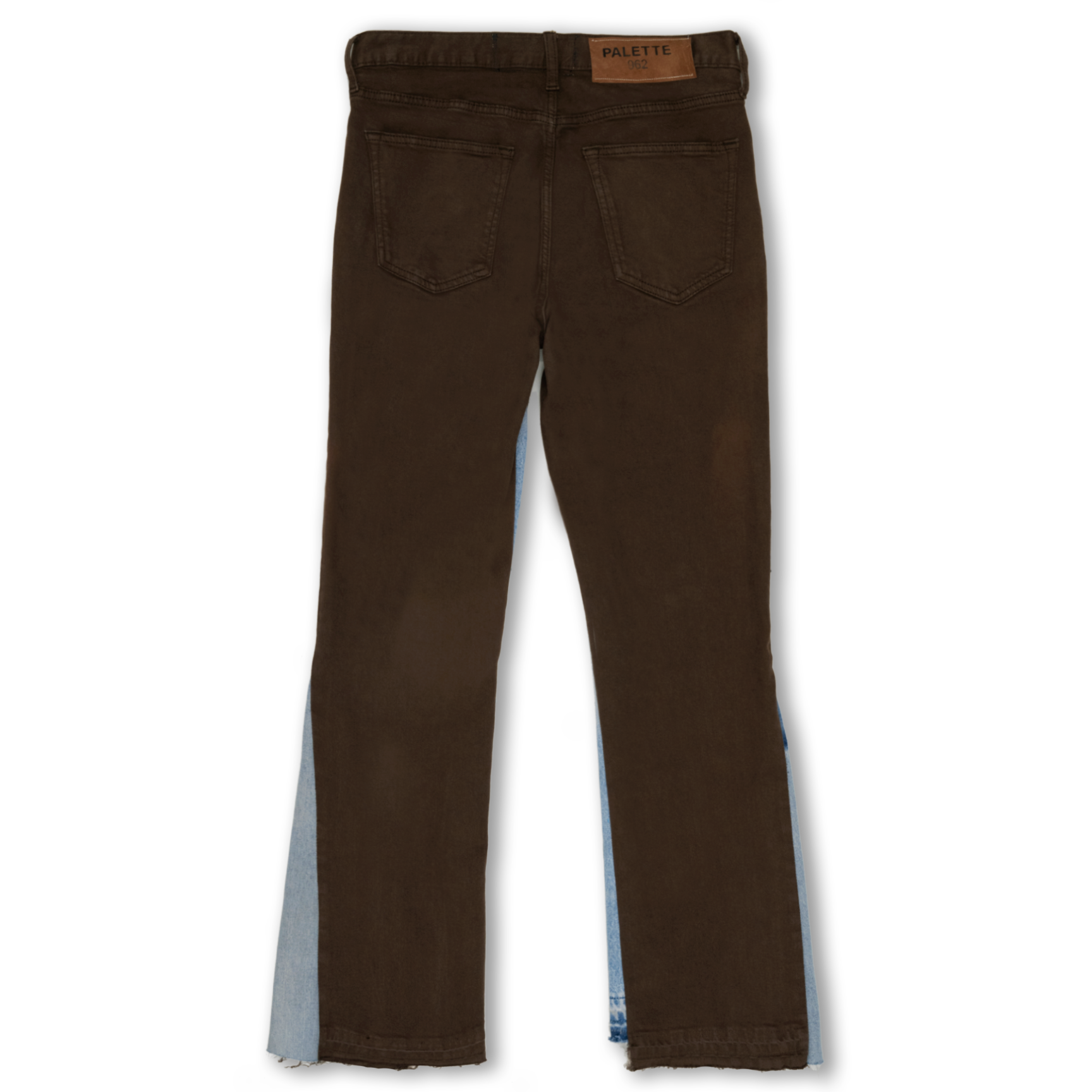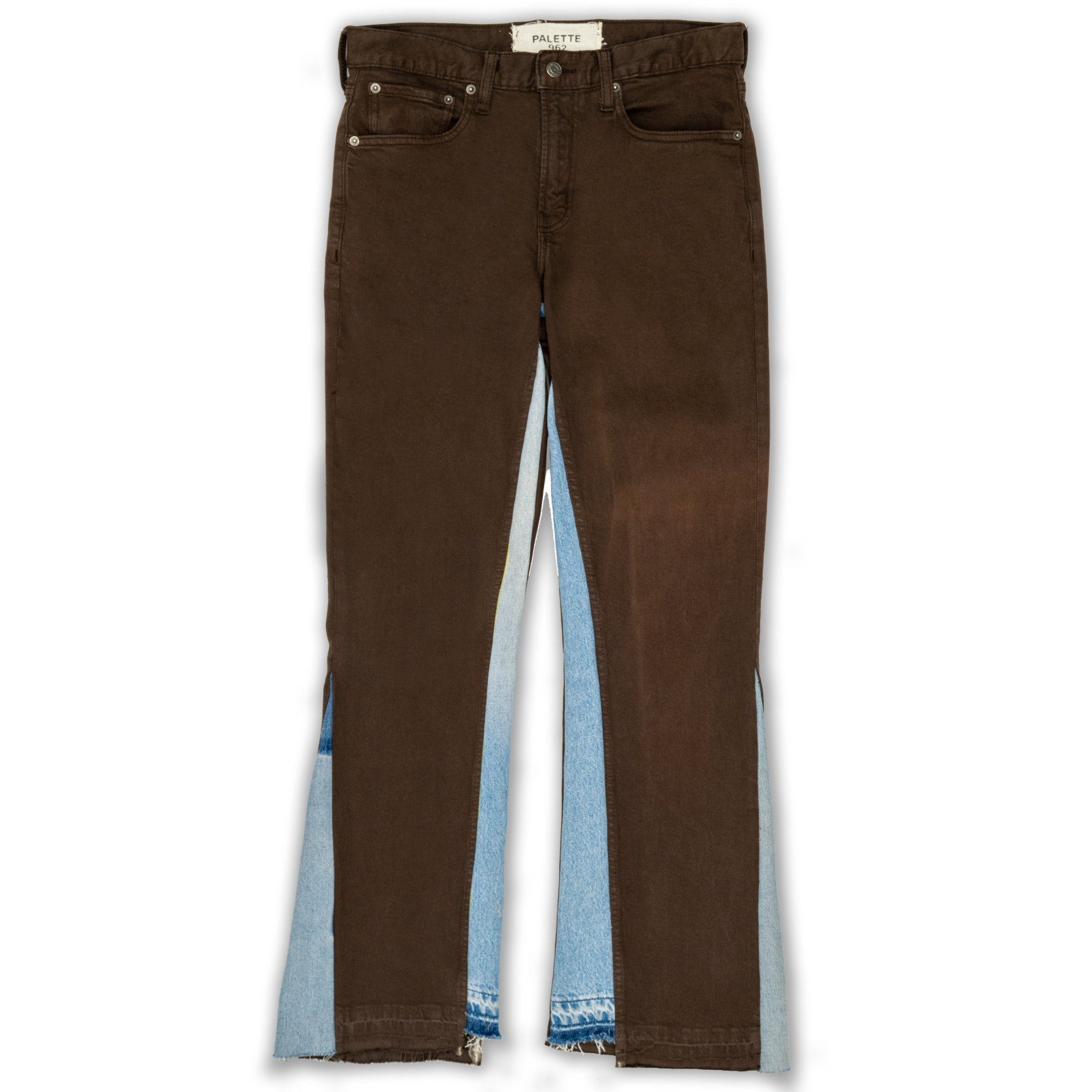 A one-of-one crafted from vintage denim, designed with a wider leg opening in a unique brown tone achieved through a sun wash. Featuring a slim fit and flared open hem. Each pant is intentionally distressed with imperfections and reinforced rips with the PALETTE962 logotype on the waistline.